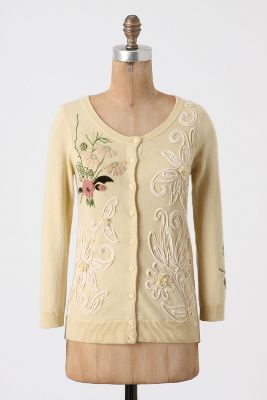 We agreed that I'd shoot for about two items, and then ended up blowing the budget and buying four. However, one (black knit top with asymmetrical ruching) was a clearance item and was only $30: a steal in the land of Anthro. Two were pants, a constant need in my wardrobe since my office is so cold, and for some reason I have trouble finding pants anywhere but Anthropologie. Clearly I needed them both. The final item was an embellished cardigan ("Blooms above the snow" -- naming the clothing must be someone's full-time job). My other embellished cardigans are my favorite wardrobe items, so I just couldn't put it back either. Fortunately I have an indulgent husband!